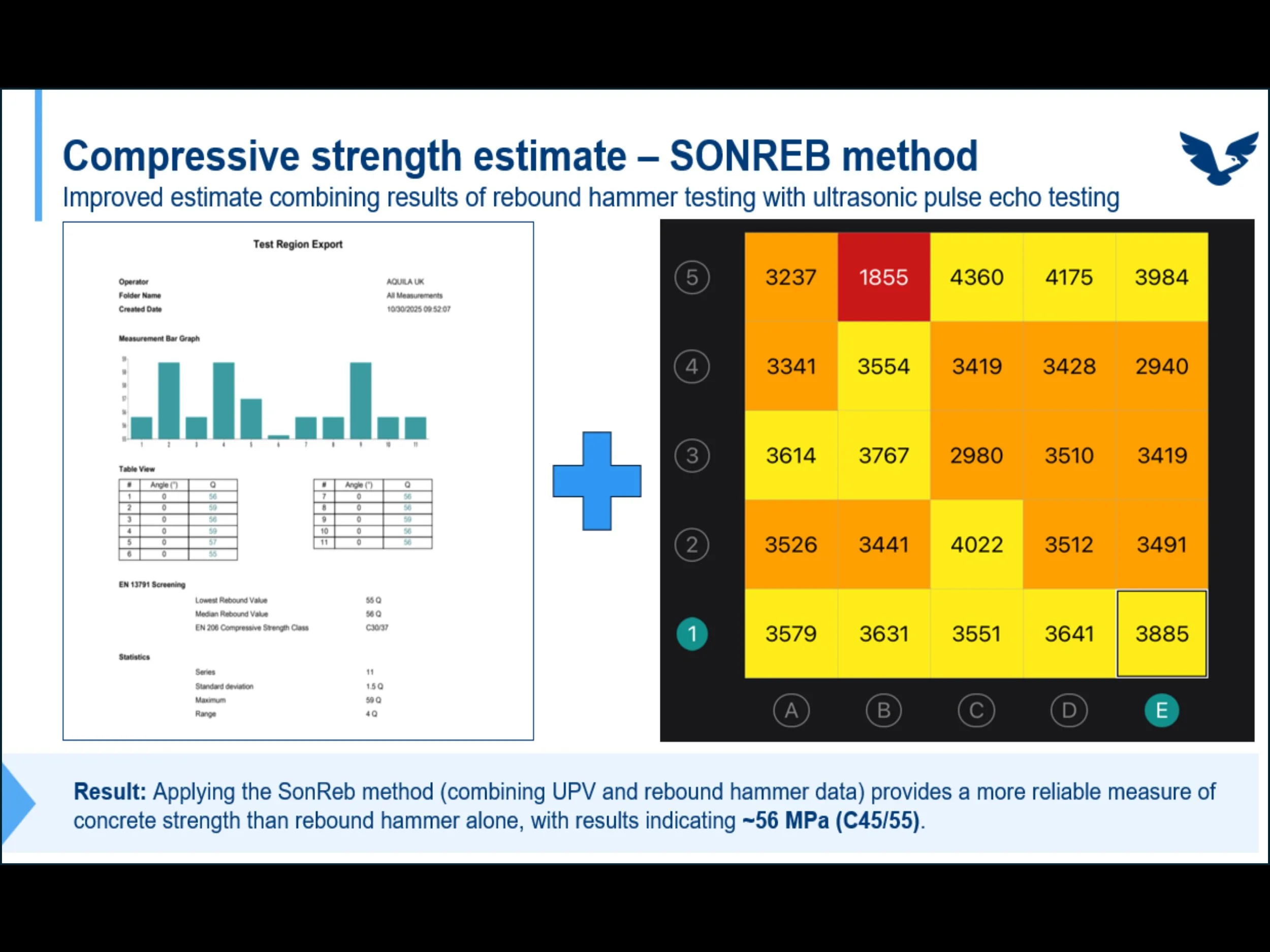 AQUILA delivered an integrated inspection, combining the expertise of UK and Swiss teams with industry leading technologies. The team utilised Schmidt hammer testing, ultrasonic pulse echo, multichannel GPR, electrical resistivity and digital twin modelling to generate a precise condition profile of concrete quality, reinforcement characteristics and corrosion probability.